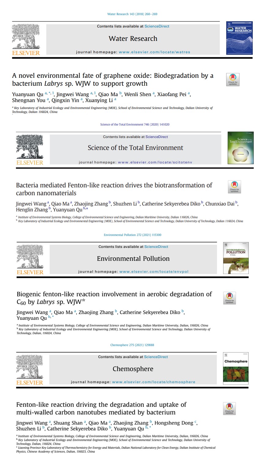 碳基纳米材料主要包括石墨烯、碳纳米管和富勒烯及其衍生物。伴随着在各个领域的广泛应用和产量的不断增加,碳基纳米材料不可避免地释放到环境中去并且难以回收。研究表明碳基纳米材料已经广泛存在于地表水、污水处理系统、沉积物和土壤等多种环境中,成为一类新型的污染物,而碳基纳米材料的生物转化研究刚刚兴起。大连海事大学环境学院王经伟、马桥等在环境领域国际知名期刊Water Research (2018,143:260-269), Science of The Total Environment (2020,746:141020), Environmental Pollution (2021, 272: 115300), Chemosphere (2021, 275: 129888) 在线发表了多篇关于碳基纳米材料生物降解降解的一系列的研究进展。