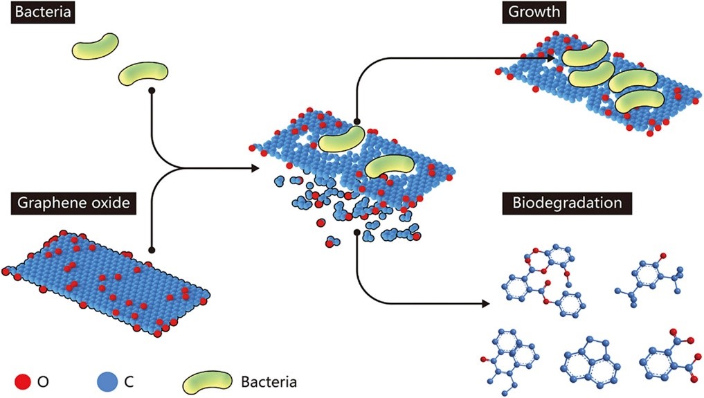 课题组首先筛选得到了能以氧化石墨烯为唯一碳源生长的菌株Labryssp. WJW,利用透射电镜、原子力显微镜和拉曼光谱等仪器对氧化石墨烯的降解进行表征。结果表明,氧化石墨烯经菌株WJW降解后碳层出现明显空洞并出现更多缺陷。多种具有芳香烃结构的中间产物在氧化石墨烯降解过程中被发现,其中包含苯甲酸等典型的微生物芳香烃代谢下游产物。利用基因组和蛋白质组技术解析表明,差异蛋白的生物信息学分析显示部分上调蛋白可能参与氧化、苯环断裂以及中间产物的跨膜运输等过程。对氧化石墨烯的降解途径进行了推测,其可先降解为苯甲酸盐类小分子芳烃,并继续通过下游的糖酵解、三羧酸循环、丙酮酸以及丁酸甲酯等途径进行进一步代谢。